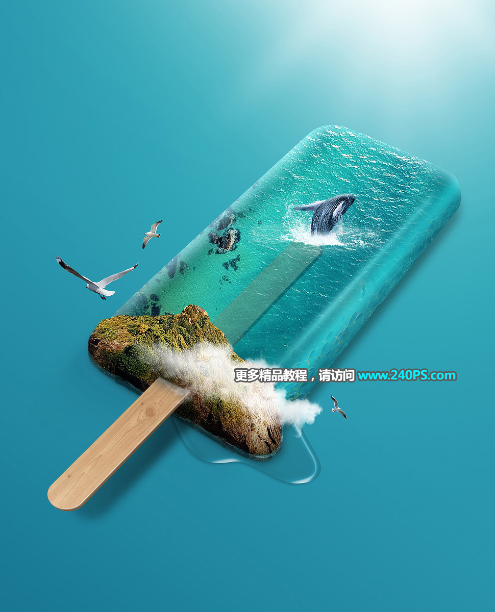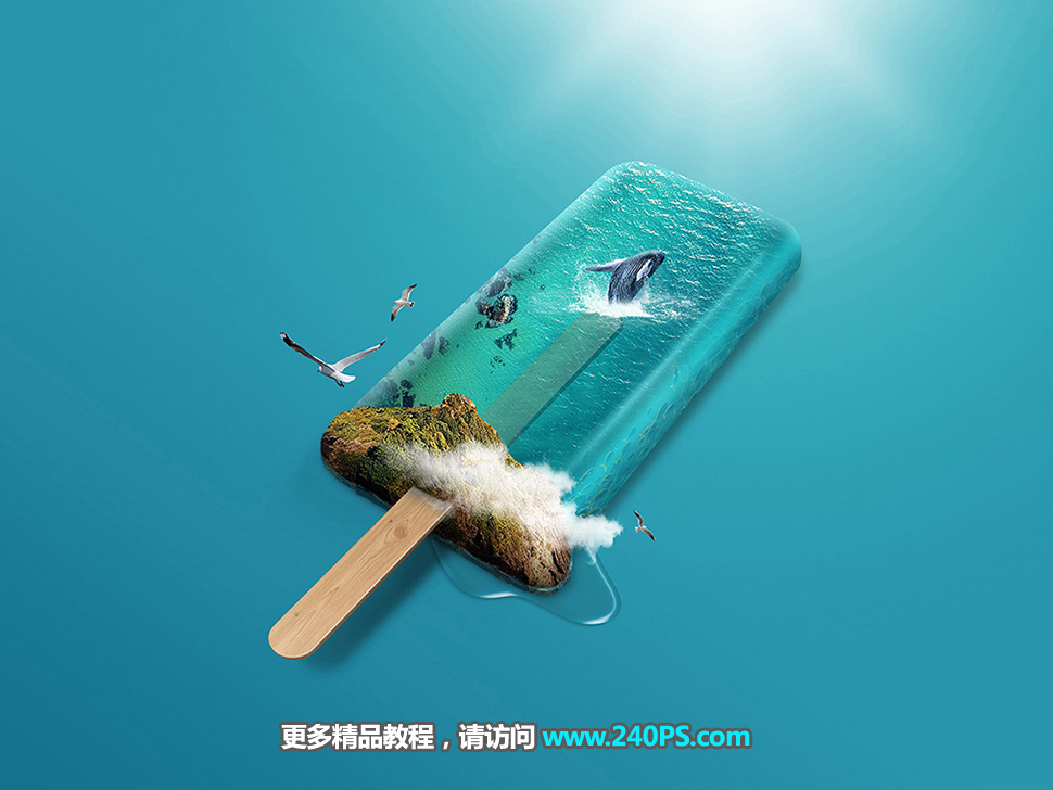 火热的夏天到了,来根清冰凉的冰棍是多么的舒爽。本篇教程作者将带你练习如何将冰棍、海面、海鸥、鲸鱼、木纹、水花、云朵创意合成一根海水冰棍,素材已提供估文章开头,希望