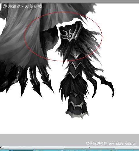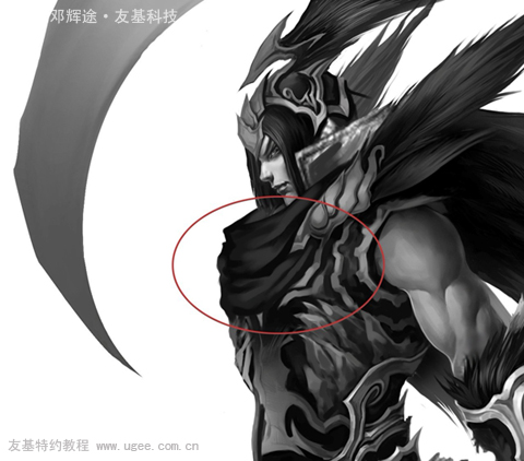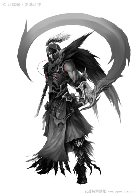 20.人物的盔甲装备都大致完成后,就可以开始绘制人物的兵器“死神镰刀”了。我在刀的脊梁位置加了一点类似脊椎骨形态的装饰物,加强了“死神镰刀”的感觉,再通过拉开明暗质感,使得武器更加厚重、锋利。到此,这张图的单色稿就完成了。