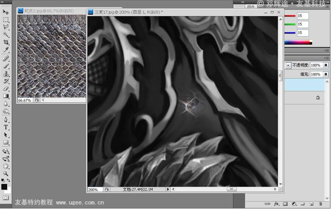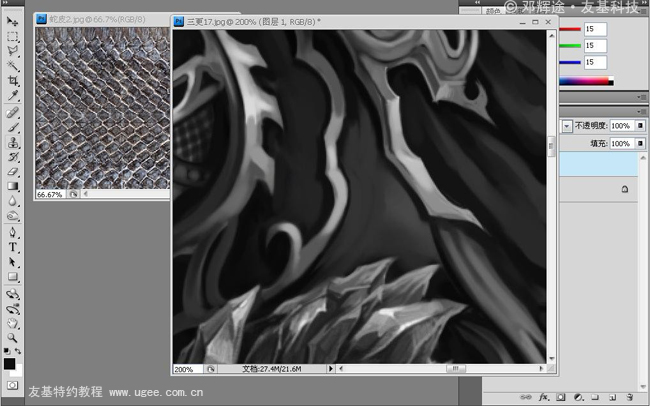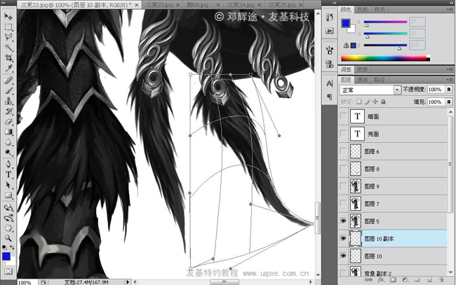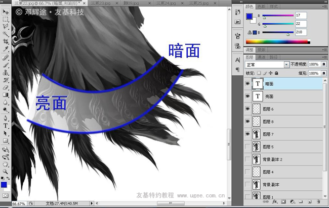 17.如何做出自然的过渡?这里我运用了加深减淡工具。在暗面的部位用加深工具把它变暗,亮面的部位用减淡工具把它提亮,这样就可以做出自然的明暗过渡效果了。