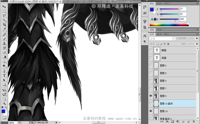 11.在人物结构大致完成时,我突然发觉整个人物竟然看起来有点矮小,于是我把人物脚的部分在PS中切掉,然后把脚的部分向下移动将人物的身高拉长,这样人物的整体效果就会显得高大了。