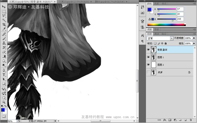 11.在人物结构大致完成时,我突然发觉整个人物竟然看起来有点矮小,于是我把人物脚的部分在PS中切掉,然后把脚的部分向下移动将人物的身高拉长,这