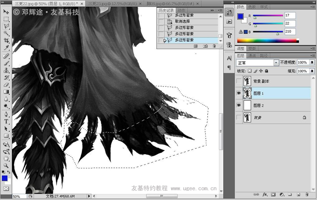 12.使用【多边形套索】工具把需要修改的长袍前端勾选出来: