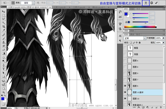 15.要在自由变换和变形模式之间切换,首先要选中羽毛所在的图层(快捷键:CTRL+T),当图层变为【自由变换模式】后再按