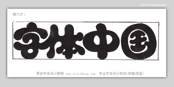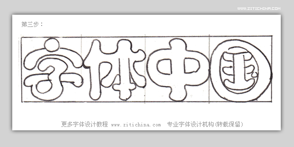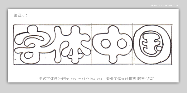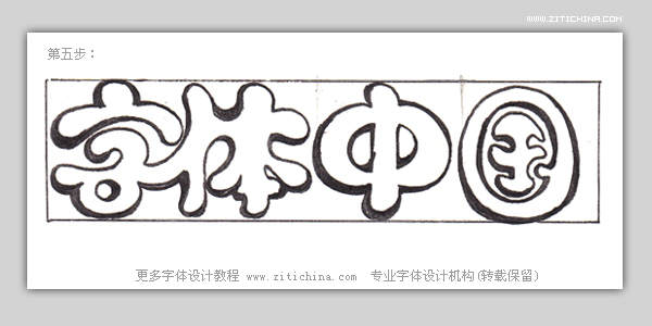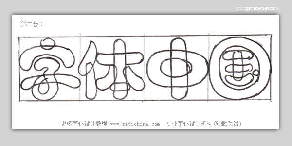 第二步:勾画出字体的轮廓,主题是圆润。特别要求注意中国二字,中字的笔画较少,所以笔画要粗一点。国字要注意那一点。大体形状出来了,继续修改细节。