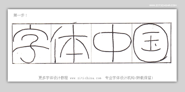 第一步:首先在纸上画好方格,写出“字体中国”4个字,我们写的是卡通的字,所以保持圆润的设计风格。写得也比较流畅。
