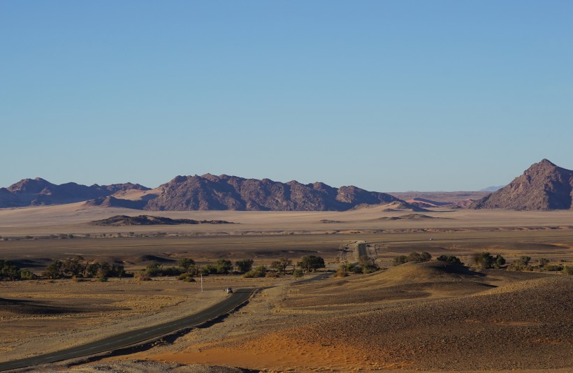 纳米比亚沿海有狭长平原;内陆全属高原、山地,一般海拔1,000米以上,最高点2,600米。中部为中央高地;东部为卡拉哈里盆地的一部分;西部沿海一带为沙漠性平原。位于西部偏北的布兰德山海拔2610米,为全境最高点。南部的奥兰治河和北部的库内内河,分别为同南非和安哥拉的界河。大地构造上纳米比亚位于著名的卡拉哈里克拉通的西北部,其境内出露最老地层为下元古界,基岩出露面积约为4600,第三纪一现代沉积(卡拉哈里层)覆盖面积约为54%。区域构造单元组成上,纳米比亚区域地质构造由以下三种单元组成:地盾区主要分布在纳米