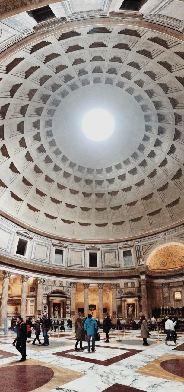 万神殿,又译潘提翁神殿,是至今完整保存的唯一一座罗马帝国时期建筑,始建于公元前27-25年,由罗马帝国首任皇帝屋大维的女婿阿格里帕建造,用以供奉奥林匹亚山上诸神,可谓奥古斯都时期的经典建筑。公元80年的火灾,使万神殿的大部分被毁,仅余一长方形的柱廊,有12.5米高的花岗岩石柱16根,这一部分被作为后来重建的万神殿的门廊,门廊顶上刻有初建时期的纪念性文字,从门廊正面的八根巨大圆柱仍可看出万神殿最初的建筑规模。