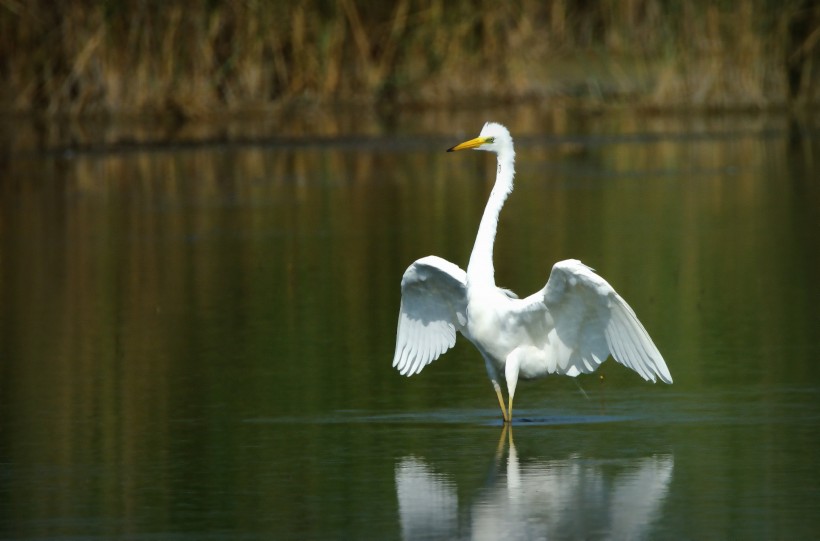 大白鹭(学名:Ardea alba)是大中型涉禽,成鸟的夏羽全身乳白色;鸟喙黑色;头有短小羽冠;肩及肩间着生成丛的长蓑羽,一直向后伸展,通常超过尾羽尖端10多厘米,有时不超过;蓑羽羽干基部强硬,至羽端渐小,羽支纤细分散;冬羽的成鸟背无蓑羽,头无羽冠,虹膜淡黄色。此鹭栖息于海滨、水田、湖泊、红树林及其他湿地。常见与其他鹭类及鸬鹚等混在一起。大白鹭只在白天活动,步行时颈劲收缩成 S形;飞时颈亦如此,脚向后伸直,超过尾部。以甲壳类、软体动物、水生昆虫以及小鱼、蛙、蝌蚪和蜥蜴等动物性食物为食。主要在水边浅水处涉水