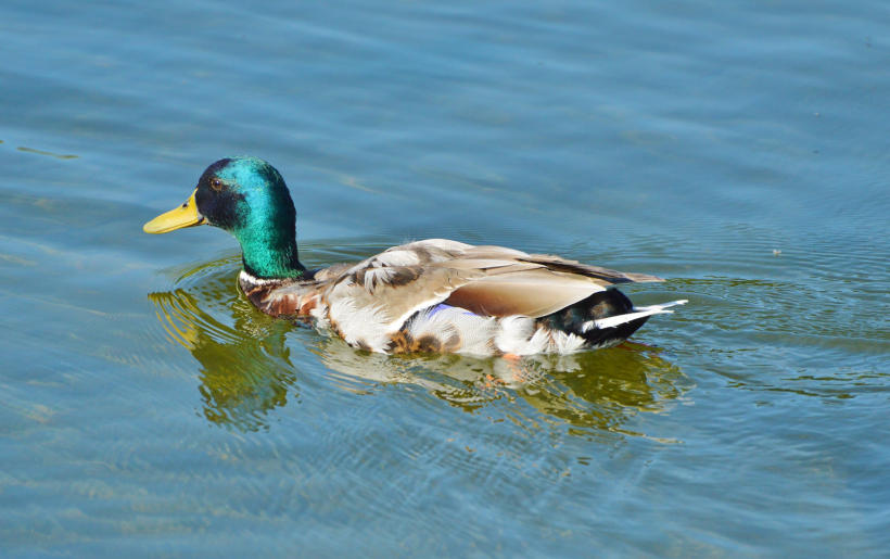 绿头鸭(学名:Anas platyrhynchos)属游禽,大型鸭类。体长47-62厘米,体重大约1千克,外形大小和家鸭相似。雄鸟嘴黄绿色,脚橙黄色,头和颈辉绿色,颈部有一明显的白色领环。上体黑褐色,腰和尾上覆羽黑色,两对中央尾羽亦为黑色,且向上卷曲成钩状;外侧尾羽白色。胸栗色。翅、两胁和腹灰白色,具紫蓝色翼镜,翼镜上下缘具宽的白边,飞行时极醒目。