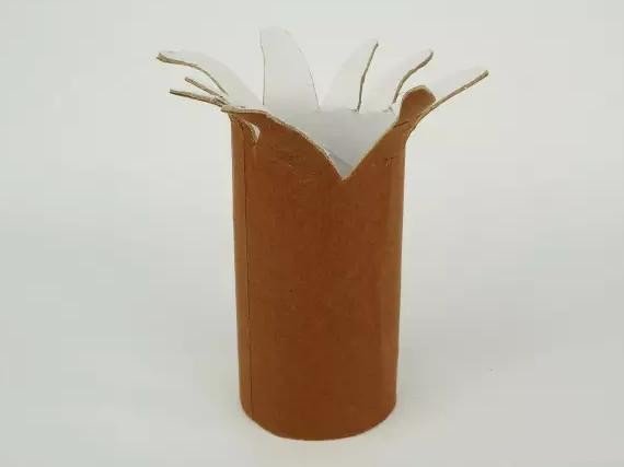 材料准备: 卷纸筒、棕色彩纸、皱纹纸、剪刀、双面胶、胶水。 第一步 用胶水把棕色彩纸粘贴在纸筒上。 第二步 在纸筒一端剪一些长短不一的切口。