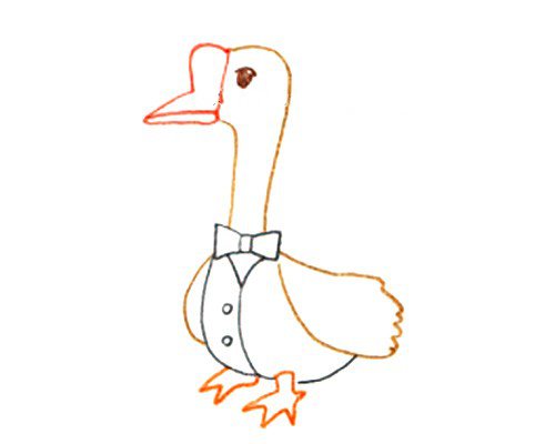 绘画成品图参考1.画鹅的头部和长长的脖子2.画胖胖的身子和漂亮的翅膀3.画上鹅的脚掌4.上色完成