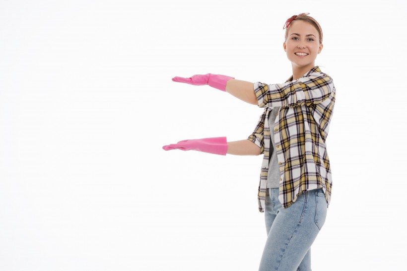 一组白色背景的商业素材图片,穿格子衬衫的美女戴着橡胶手套,做出打扫卫生的动作,可作为商业素材使用。