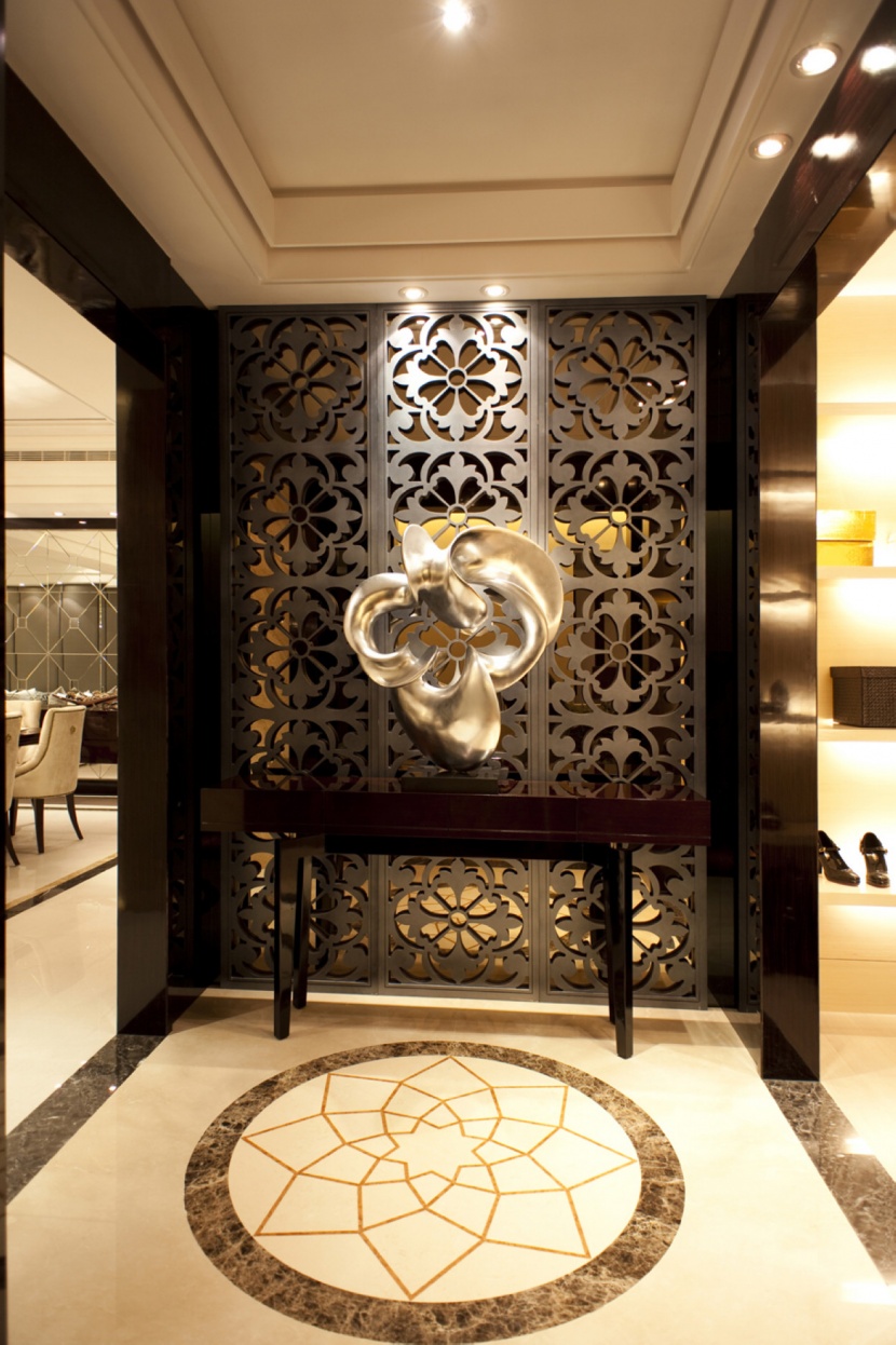 客厅银狐大理石的壁面,置入突出的黑云石电视柜体,让现代科技在中式风格中的出场,并不显得突兀。柜体旁刻意挖空,置入镜面与中式桌几、摆饰,让空间意蕴深厚却能深浅出入,有令人眼前一亮的表现。屏风是过渡空间常用的工具。客厅沙发背后置入中式风格屏风,拉高尺度、透空的几何图案变形设计,与开放式的书房相邻,成为功能区域间隔的界限。空间通透,创造出一个若即若离的共享空间。光影隐隐映现地面,曼妙生姿。白色筒形的灯笼改造成的吊灯,显得如此轻盈,高姿态点明却不刻意强调中式大宅的地位。