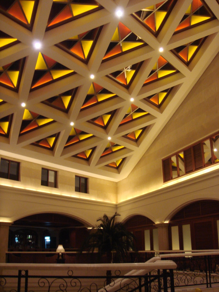 天津金泽大酒店位于繁华的南京路上,建筑面积约为25000多平方米,拥有235套客房、酒吧、自助餐厅、中餐厅、多功能会议厅等,是一家配套设施齐全的标准五星级酒店。我们将该酒店定位为现代欧式,古罗马的装饰元素穿插其中,通过米黄云石、彩绘玻璃等现代材料将一个高贵、豪华的具有现代贵族气息酒店氛围烘托了出来。整个大堂的效果,则是借鉴了米开朗其罗所设计的坎比多利欧大广场。地面传统的欧式拼花和天棚处的彩绘玻璃相互呼应,和中心部位的喷泉造景、两侧的拱券柱式结构以及传统的欧式木制窗扇,将一个传统罗马广场街景呈现在客人面前。
