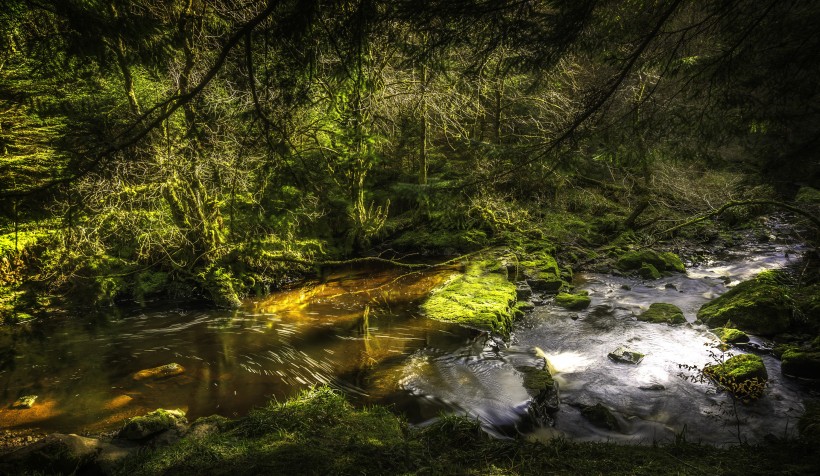 溪水静静地流着,发出低语,水面像油一样,起着旖旎的水绉。
