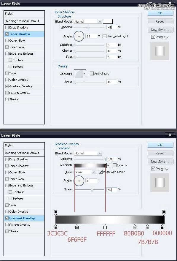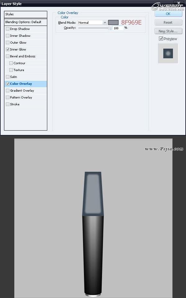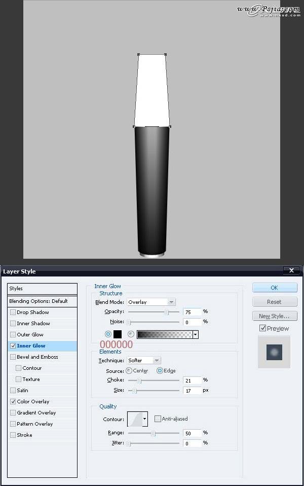 使用矩形工具(U)或钢笔工具(P)创建下图所示的形状,并将其命名为“NECK”。给它添加图层样式如下。(overlay意为叠加)。(图07、08)