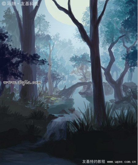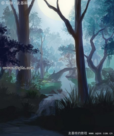 11.此前都是用临近色作画,纯度也不高,所以画面很灰,现在该丰富下色彩了。新建一层,模式为叠加,画笔选用喷枪,把色彩叠上去,中间的草地用绿色,树的暗部及近处的草堆用深蓝色,月亮的部分则用暖黄色。