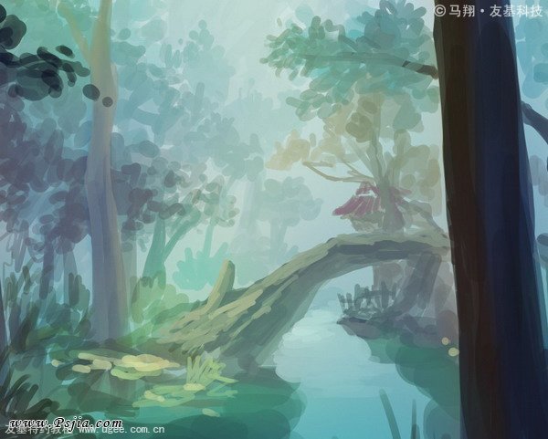 17.使用叠加模式的喷枪喷上河水透出的蓝色,这张画我想画得比较梦幻,所以纯度会比较高,色彩显得夸张一些。