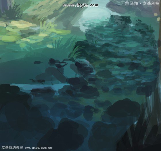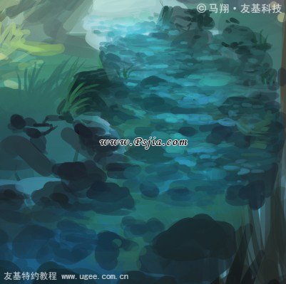 16.接下来是小溪的部分。我想河水清澈见底,所以先把河底画出来,用深色画,如果不够深,最后即使画出水的反光部分,整体效果也不好。河底都是石头之类的东西,笔触潦草点没关系,最终大部分都会被遮掉的。