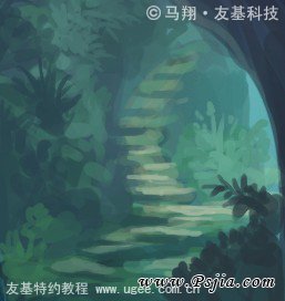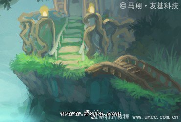 26.再适当补充一下前景的草丛,然后用喷枪加强环境色,选叠加模式喷淡蓝色,符合整体的气氛。
