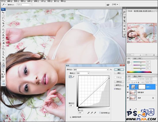 新建“曲线”调节图层,压暗相片中的高光部分。由于原始图片中的高光部分过亮,在下一步为照片加色的时候,高光部分无法上色,因此要在这一步把照片的高光区域压暗。
