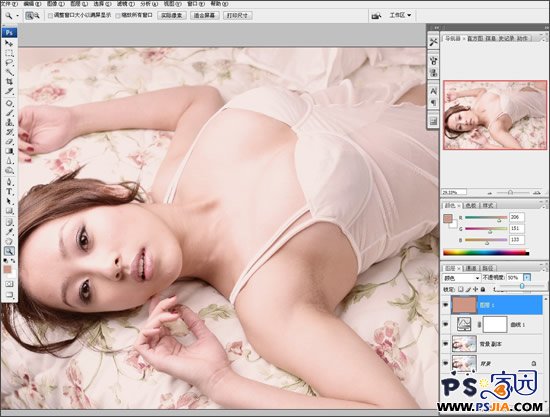 3.做这种色调,想要先调节原片的亮度与对比度,之后整体做一层颜色。应该特殊留意肤色的处理,使原本的黄肤色表现得更为温和、细腻。在调修时保持一点原始图片的颜色会更为自然。当然,这一步也可通过调节图层的透明度来控制。