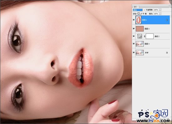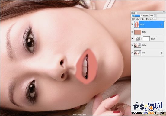 留意:在为嘴唇加上颜色的时候要细致,避免色彩影响到牙齿与面部,必要时可把照片放大至100%上面执行调节。