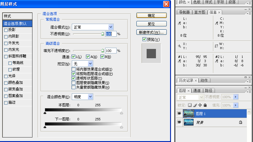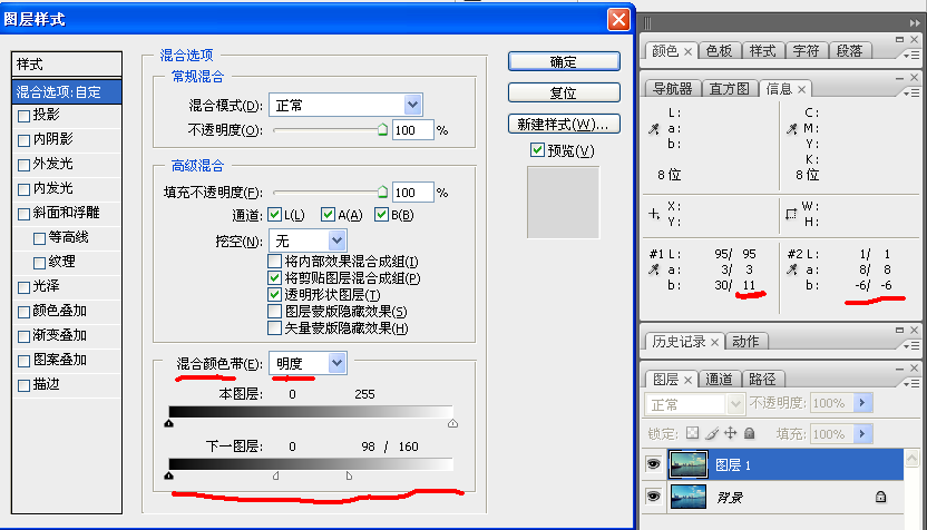 这时候我就想起了 混合颜色带 这个工具,在 图层—图层样式—混合选项 中