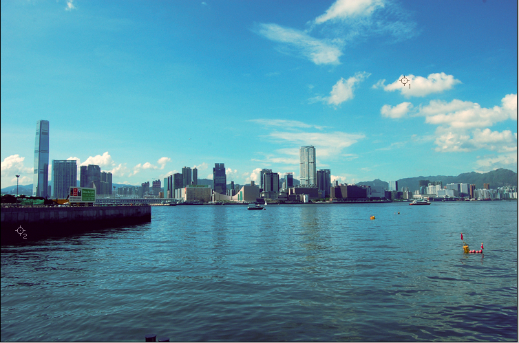 然后调整 混合颜色带,因为我想调整天空,即#1点所在区域,它与#2点所在区域,在亮度是有很大差异的,