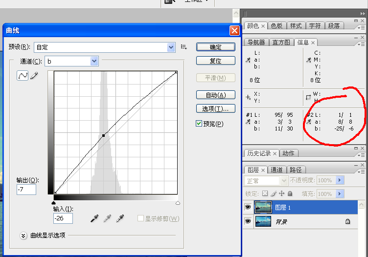 ctrl+左键点击#2,这是曲线上就会相应的出现一个点,然后我一边按键盘方向键的 上键 一边观察着右侧#2的数值变化,然后很感觉的在 -6 处停了下来,因为毕竟是海中的倒影,微微的蓝色应该是有的。