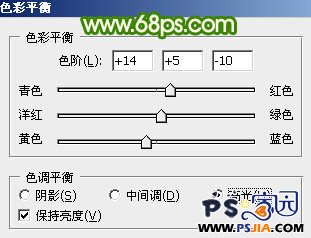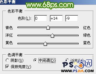 2、创建色彩平衡调整图层,对中间调及高光进行调整,参数设置如图6,7,效果如图8。 图6 图7 图8 3、创建可选颜色调整图层,对洋红进行调整,参数设置