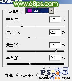 | 3、创建可选颜色调整图层,对洋红进行调整,参数设置如图9,这一步简单调整人物嘴唇部分的颜色,效果如图10。 |