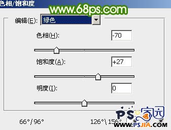 | 4、创建色相/饱和度调整图层,选择绿色,再用吸管吸取背景部分的绿色并调整数值,参数设置如图11,确定后只保留背景部分,其它部分用黑色画笔擦出来。这一步主要是调整背景部分的颜色,效果如图12。 |