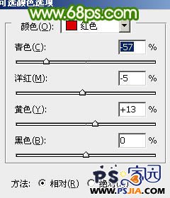 | 10、创建可选颜色调整图层,对红,黄进行调整,参数设置如图20,21,效果如图22。 |