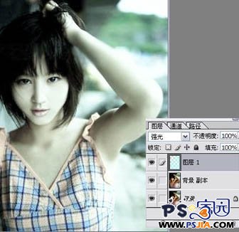 2、新建一个图层,填充青色:#99EDE6,图层混合模式改为“强光”,效果如下图。 |