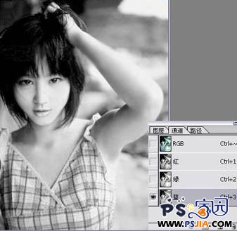 3、把背景图层复制一层,得到背景副本,点通道面板,选择蓝色通道按Ctrl + I 反相。 |