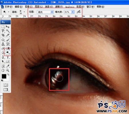 3、利用减淡和加深工具分别对眼睛进行修饰,是眼睛更有神,减淡和加深工具在修饰眼睛是的设置如下图,减淡用高光,加深用阴影,曝光度可以适当的