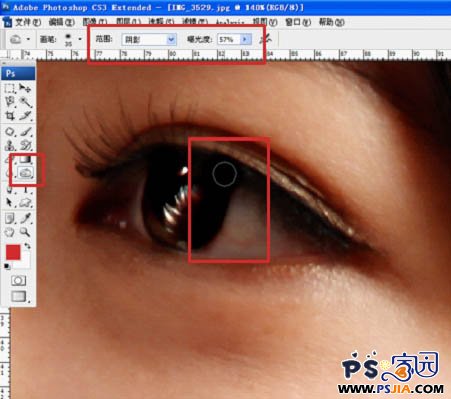 | 3、利用减淡和加深工具分别对眼睛进行修饰,是眼睛更有神,减淡和加深工具在修饰眼睛是的设置如下图,减淡用高光,加深用阴影,曝光度可以适当的降低。 |