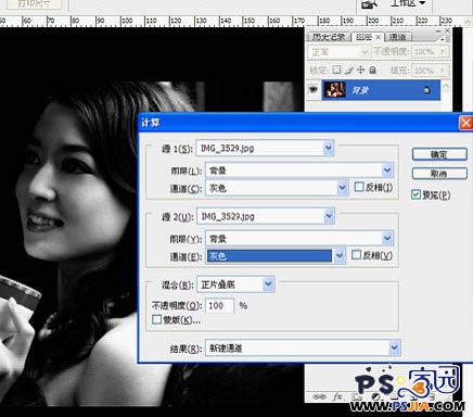 | 4、利用通道计算,计算出曝光过度的区域,参数如下:计算出一个通道alpha1,载入选区后要删除这个通道,否则你存储的时候只能是PSD的格式。 |
