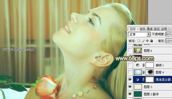 6、创建通道混合器调整图层,对红色进行调整,参数设置如图12,确定后把图层不透明度改为:50%,效果如图13。