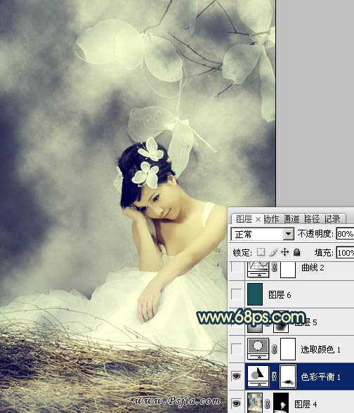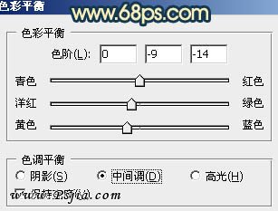 6、创建色彩平衡调整图层,对中间调及高光进行调整,参数设置如图11,12,确定后把图层不透明度改为:80%,效果如图13。