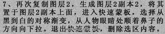 7、再次复制图层2,生成图层2副本2,将其置于图层2副本上面,进入快速蒙版,选择从黑到白的对称渐变,从人物眼睛处顺着鼻子的方向向下拉。退出快速蒙版,按Delete删除选区内容。