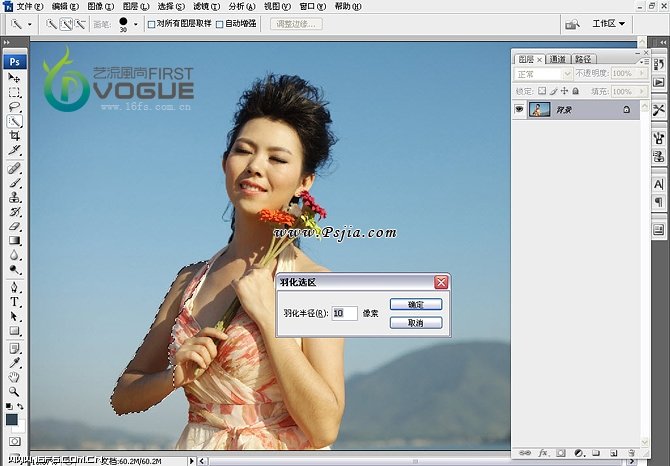 01:打开图片后,用快速选取工具将人物左边胳膊选出来,羽化半径为10像素.