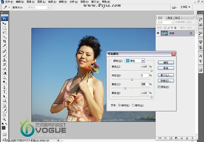03:执行图像调整/可选颜色:颜色-青色 青色+100. 黄色-34.黑色+100