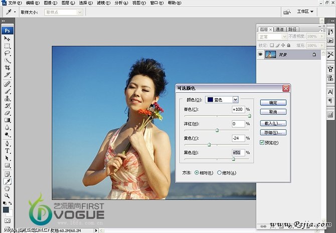 04:颜色-蓝色,青色+100 黄色-24 黑色+51 (注:这两步主要是针对天空背景调色的)