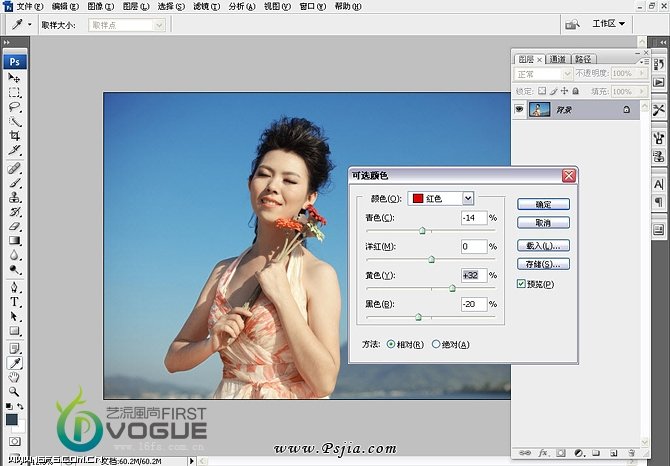 06:可选颜色--红色, 青色-14 黄色+32 黑色-20(注:这两步可选颜色的调整是针对人物肤色的)