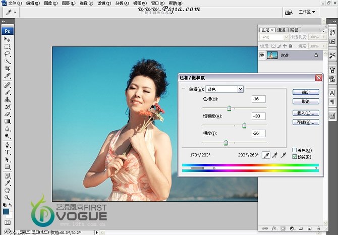 12:色相饱和度参数如图所示,色相-16 饱和度+30 明度-26
