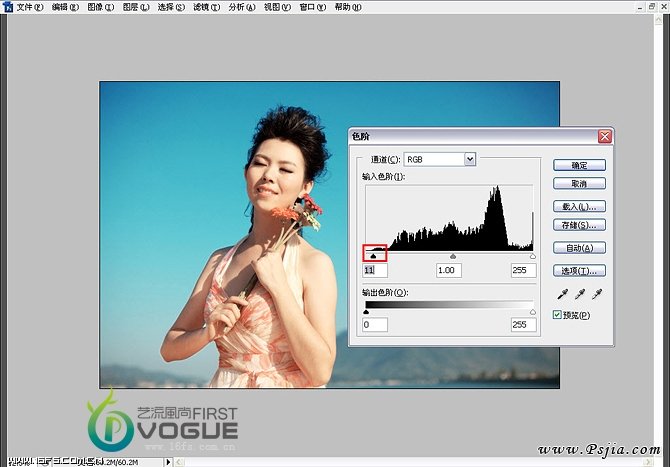 13:执行色阶命令:色阶调整如图所示,将暗调适当压暗一点