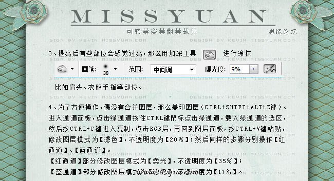 3、提亮后有些部位会感觉过亮,那么用加深工具进行涂抹,比如肩头、衣服、手指等部位。 4、为了方便操作,我没有合并图层。新建一个图层,按Ctrl
