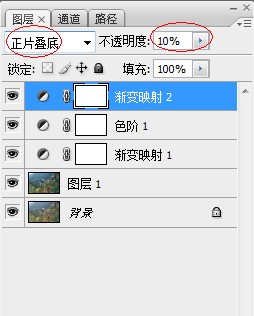 再新建一层绿色到黄色的“渐变映射”,图层混合模式改为“正片叠底”,不透明度为10%!如图: